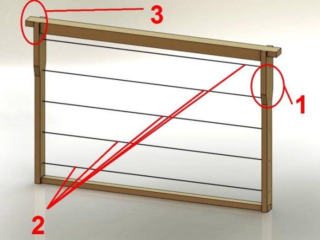 - Το πλαίσιο αποτελείται από λωρίδες πάνω, κάτω και πλευρικά. Το άνω στοιχείο και στις δύο πλευρές σχηματίζει προεξοχές - ώμους (3). Οι κορυφές των πλευρικών σχισμών είναι φτιαγμένες με φωτοβολίδα (1) για τη διατήρηση των κενών μεταξύ των πλαισίων στην κυψέλη. Για να στερεώσετε την κηρήθρα, ένα σύρμα (2) τεντώνεται σε αντίθετες λωρίδες.
