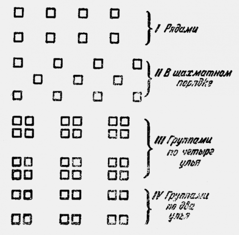 - Το σχήμα "σε ομάδες" είναι το πιο δημοφιλές για νομαδικά και στάσιμα μελισσοκομεία διαφορετικών μεγεθών. Οι ομάδες σχηματίζονται από παρακείμενες κυψέλες των 2-6 τεμαχίων. Απέμεινε απόσταση 50 εκ. Ανάμεσα στα σπίτια. Η απόσταση των σειρών είναι από 4 έως 6 μ.