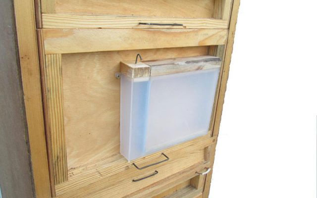 - Δομή. Τα φωτιστικά κατασκευάζονται με τη μορφή δοχείων για να ταιριάζουν στο πλαίσιο. Συνδέστε το κουτί κοντά στη φωλιά. Επιπλέον - είναι βολικό να ταΐζετε τις αποικίες μελισσών σε βροχερό καιρό. Μείον - για να προσθέσετε φαγητό, τα έντομα πρέπει να ενοχλούνται.