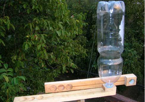 2 υποδοχές με εσοχές για ένα μπουκάλι κόβονται από ράβδους ή κομμάτια μοριοσανίδας. Τα στοιχεία συνδέονται στον τοίχο της κυψέλης. Οι πλευρικές οπές στο μπουκάλι σφραγίζονται με ταινία. Το δοχείο γεμίζει με σιρόπι, φελλό. Η κολλητική ταινία σχίζεται ξαφνικά, το μπουκάλι τοποθετείται πάνω στις θήκες με τις τρύπες κάτω. Ο ρυθμός ροής του σιροπιού εξαρτάται από το ιξώδες του και τη διάμετρο των οπών.