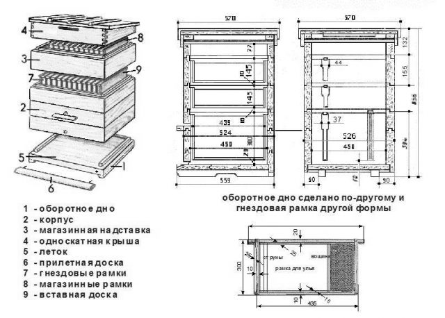 Ένας αρχάριος μελισσοκόμος πρέπει να γνωρίζει ότι για να συναρμολογήσει μια κυψέλη πολλαπλών σωμάτων με τα χέρια του, μπορούν να ληφθούν σχέδια ενός μοντέλου για οποιονδήποτε αριθμό πλαισίων, για παράδειγμα, 10 καρέ Dadan. Σύμφωνα με αυτό το σχέδιο, μπορείτε να φτιάξετε ένα σπίτι για διαφορετικό αριθμό κουφωμάτων. Το γενικό σχήμα είναι το ίδιο, μόνο τα μεγέθη διαφέρουν.