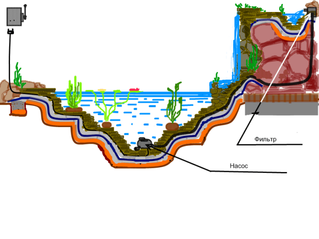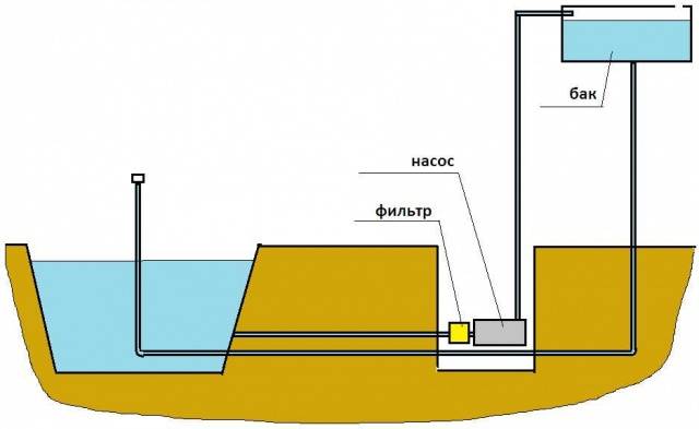 Έτσι, εάν το λάκκο είναι εντελώς έτοιμο, τότε θα πρέπει να προχωρήσετε στην εγκατάσταση της αντλίας. Η αρχή της λειτουργίας της αντλίας είναι πολύ απλή εδώ. Το νερό ρίχνεται στη δεξαμενή μέσω του ακροφυσίου, εισέρχεται στον αγωγό, υφίσταται χονδροειδείς και λεπτούς καθαρισμούς και στη συνέχεια το καθαρισμένο νερό περνά ξανά από το ακροφύσιο.