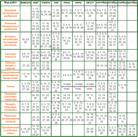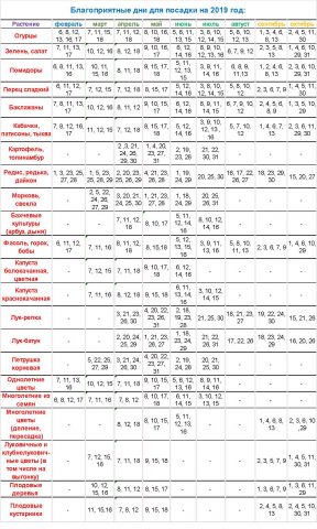 Οι προτεινόμενες ημέρες προσγείωσης βασίζονται σε σεληνιακές φάσεις. Σύμφωνα με το ημερολόγιο, οι ρίζες καλλιεργούνται στο φεγγάρι που εξασθενεί: καρότα, πατάτες, ραπανάκια, τεύτλα. Φυτά που σχηματίζουν φρούτα στο πάνω μέρος του εδάφους - στο φεγγάρι που μεγαλώνει (ντομάτες, όσπρια, αγγούρια, λάχανο).