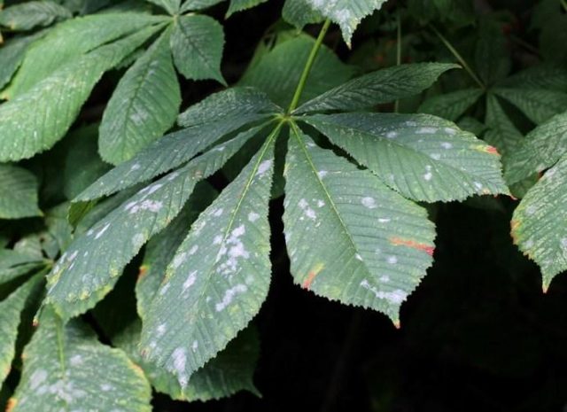 Εκτός από τη σκουριά, το ωίδιο είναι μια άλλη ασθένεια που προσβάλλει τα κάστανα. Αυτή η ασθένεια προκαλείται από έναν ειδικό τύπο μύκητα. Μόλις προκύψουν βέλτιστες συνθήκες θερμοκρασίας και υγρασίας, αρχίζει να πολλαπλασιάζεται ενεργά. Επίσης, η ανάπτυξή του μπορεί να προκληθεί από ανισορροπία αζώτου και λιπασμάτων ποτάσας στο έδαφος. Ως αποτέλεσμα της βλάβης, μια χαρακτηριστική γκρι-λευκή άνθιση σχηματίζεται στα φύλλα του φυτού. Επιπλέον, σκούροι καφέ σφαιρικοί σχηματισμοί μπορούν να παρατηρηθούν στις πλάκες φύλλων του κάστανου - αυτοί είναι μυκητιακοί σπόροι. Η μακροχρόνια απουσία θεραπείας οδηγεί στο γεγονός ότι τα φύλλα του φυτού τελικά γίνονται καφέ και πεθαίνουν.