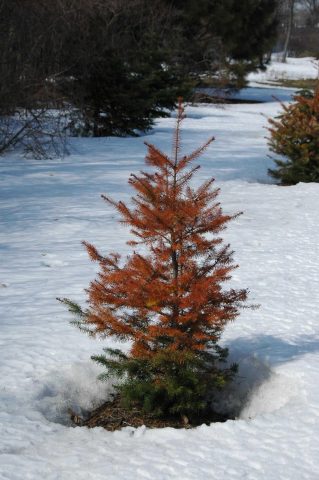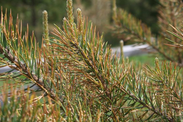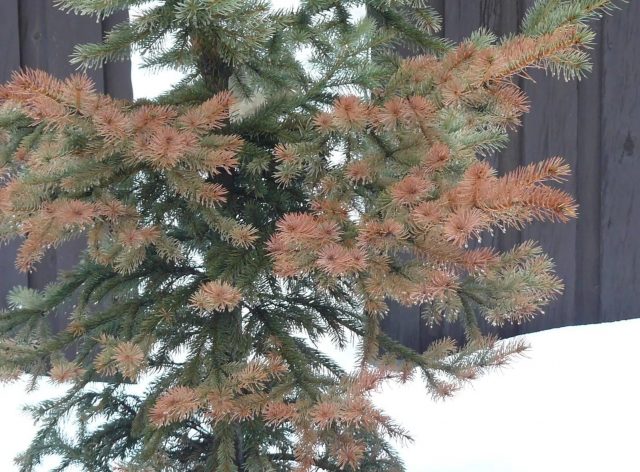 Συμβουλή! Για την καταπολέμηση ασθενειών των βελόνων, τα παρασκευάσματα που περιέχουν χαλκό είναι πιο αποτελεσματικά. - Εγκαύματα άνοιξη. Αυτή η ασθένεια δεν είναι μολυσματική. Την άνοιξη, οι βελόνες επηρεάζονται σοβαρά από το ηλιακό έγκαυμα. Αυτό συμβαίνει συνήθως σε καθαρό καιρό, όταν το χιόνι δεν έχει λιώσει ακόμα. Υπό τις επιπτώσεις του ήλιου και του ανέμου, οι βελόνες χάνουν την υγρασία και γίνονται κίτρινες. Για την αποφυγή εγκαυμάτων, τα φυτά καλύπτονται με ένα λευκό μη υφασμένο πανί την άνοιξη.