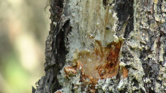 - Βακτηριακή σταγόνα. Η ήττα καλύπτει δέντρα διαφορετικών ηλικιών. Πρώτα, οι βελόνες γίνονται κίτρινες και μετά γίνονται κόκκινες. Εμφανίζονται ρωγμές στους κορμούς, από τους οποίους προεξέχει μαύρο υγρό. Ταυτόχρονα, το ξύλο έχει ξινή μυρωδιά.