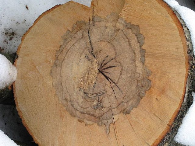 - Λευκό σάπιο ξύλο. Με την ανάπτυξη της νόσου, ινώδη μυκήλιο και σκοτεινές κυματοειδείς σχηματισμοί εμφανίζονται στο ξύλο. Η βλάβη παρατηρείται από τη βάση των φυτών σε ύψος 3 μ. Ταυτόχρονα, σχηματίζονται μεγάλες αναπτύξεις στις ρίζες.