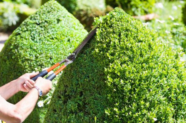 - Τυφλός. Πρόκειται για μια διάτμηση με μεγάλες ψαλίδες στον κήπο, ανεξάρτητα από τη θέση των κλαδιών και των μπουμπουκιών. Αυτή η μέθοδος χρησιμοποιείται όταν το στέμμα είναι πλήρως διαμορφωμένο και απλά πρέπει να το διατηρήσετε στις απαιτούμενες διαστάσεις. Η τυφλή μέθοδος χρησιμοποιείται κατά την κοπή φρακτών ή θάμνων, που έχουν τη μορφή γεωμετρικών σχημάτων.
