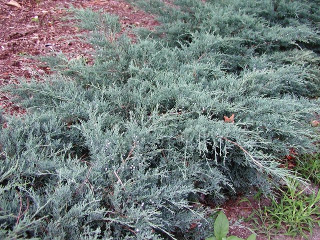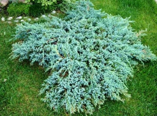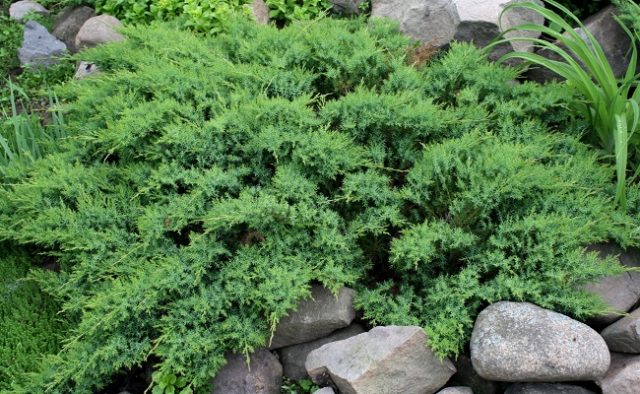 - Πράσινο χαλί. Συνήθης, νάνος τύπου Juniper. Έχει στεφάνη από μαξιλάρι. Η ετήσια ανάπτυξη είναι 25 εκ. Οι νεαροί βλαστοί είναι όρθιοι, αλλά γρήγορα γέρνουν και πλέκονται, σχηματίζουν έναν θάμνο ύψους 10 εκ. Και διαμέτρου 1,5 μ. Στα κλαδιά της καλλιέργειας υπάρχουν πράσινες βελόνες με μπλε λωρίδα και μπλε κώνους. Το φυτό είναι ανεπιτήδευτο, ανθεκτικό στον παγετό, ανθεκτικό στην ξηρασία.