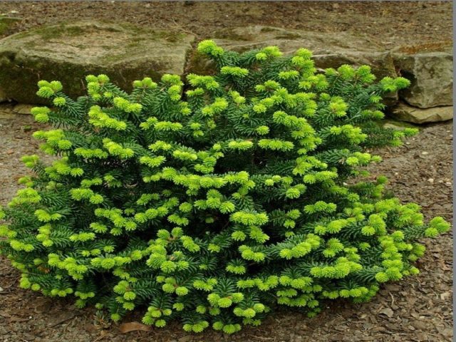 Το έλατο έχει ένα μικροσκοπικό μέγεθος, το ύψος του δεν υπερβαίνει τα 50 cm, μεγαλώνει αργά, ετησίως - όχι περισσότερο από 4 cm. Η κορώνα του φυτού είναι σφαιρική ή ελαφρώς πεπλατυσμένη, με διάμετρο περίπου 0,8 m. Οι βελόνες είναι ανοιχτό πράσινο, μαλακό, πυκνό και μακρύ - από 8 έως 20 mm, με καμπύλες άκρες. Ο φλοιός του δέντρου είναι λείο, ευχάριστο χρώμα τέφρας, χωρίς ρωγμές. Τα μπουμπούκια είναι εκπληκτικά όμορφα, μοβ χρώμα, τοποθετημένα κάθετα.