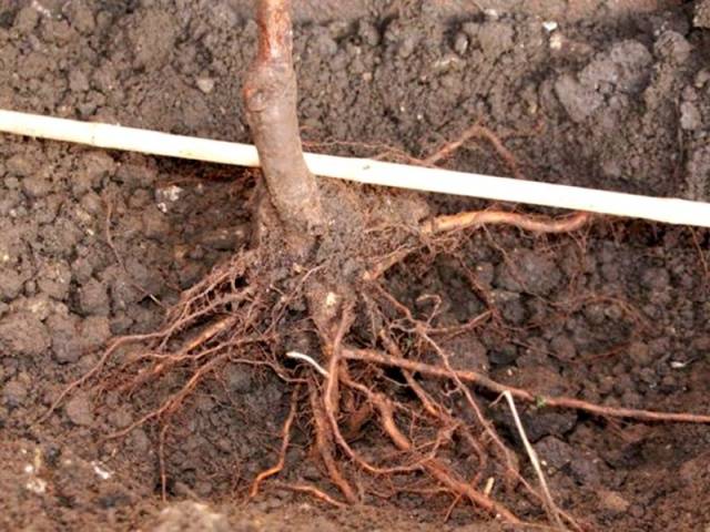 - Απλώστε το ριζικό σύστημα ενός νεαρού δέντρου και τοποθετήστε το κάθετα στην τρύπα προσεκτικά, χωρίς να λυγίσετε τις ρίζες.