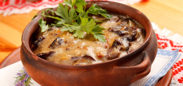 Μετά την προετοιμασία όλων των συστατικών του ψητού, μένει να τα τακτοποιήσετε σε κεραμικά δοχεία. Όλα τα συστατικά χύνονται με καυτή ξινή σάλτσα κρέμας και αποστέλλονται στο φούρνο προθερμασμένο στους 180 ° C για 25 λεπτά.