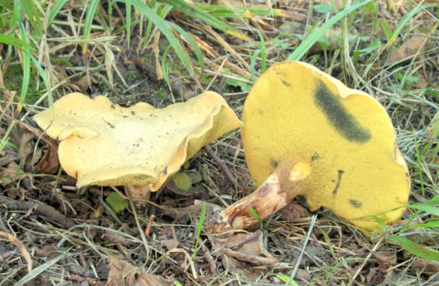 Το εσωτερικό μέρος του ποδιού δεν έχει κενά, είναι συμπαγές. Δεν υπάρχει περίεργος δακτύλιος (το λεγόμενο "φούστα") πάνω του. Εάν το σώμα των φρούτων έχει υποστεί ζημιά, δεν υπάρχει γαλακτώδης χυμός στο κομμάτι. Υπάρχει μια ελαφριά πάχυνση στη βάση.