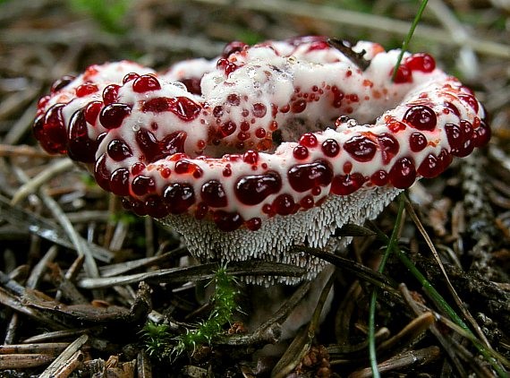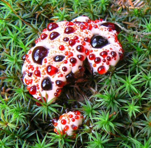Το υγρό είναι ιξώδες, κολλώδες, χρησιμεύει ως ξεχωριστό χαρακτηριστικό της εμφάνισης και ως πρόσθετη πηγή διατροφής. Το Hydnellum Peka είναι το μόνο μανιτάρι που μπορεί να χαρακτηριστεί ως αρπακτικό. Το έντονο χρώμα των σταγόνων και η συγκεκριμένη μυρωδιά μυρωδιών προσελκύουν έντομα. Προσγειώνονται στην επιφάνεια του σποροκαρπίου, προσκολλώνται και γίνονται τροφή για τον μύκητα.