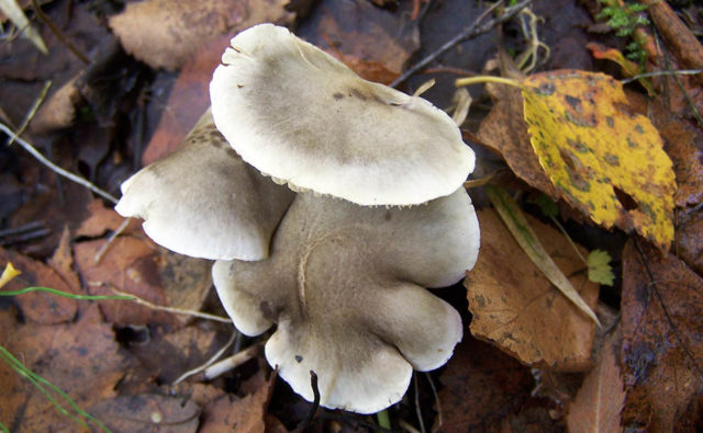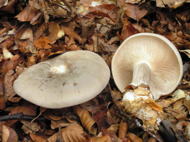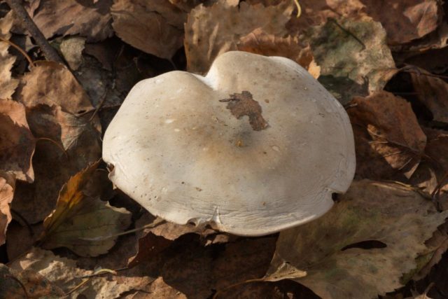 Το χρώμα του μανιταριού είναι γκρι-γκρι, μερικές φορές με ελαφριά κίτρινη απόχρωση. Στο κεντρικό τμήμα, το καπάκι είναι πιο σκούρο από ό, τι στις άκρες. Στο κάτω μέρος υπάρχουν συχνές λευκές πλάκες στα νεαρά σώματα φρούτων και κιτρινωπές στην ενήλικη ζωή, κάπως κατεβαίνοντας στο στέλεχος.