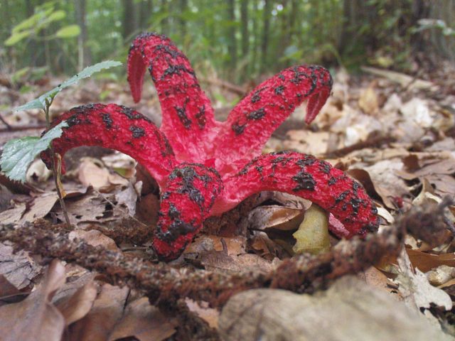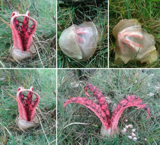 Μετά τη ρήξη του μπροστινού μέρους, η συνταγή αναπτύσσεται αρκετά γρήγορα, αντιπροσωπεύοντας από 3 έως 8 κόκκινους λοβούς. Αρχικά, συνδέονται μεταξύ τους στην κορυφή, αλλά σταδιακά διαχωρίζονται και κάμπτονται προς τα έξω. Το χρώμα τους ποικίλλει από κρέμα ή ροζ έως κοράλλι, σε παλιά δείγματα ξεθωριάζει και αποκτά ξεθωριασμένους τόνους. Στη συνέχεια, το καρποφόρο σώμα παίρνει τη μορφή ενός αστεριού ή ενός λουλουδιού με μακριά πέταλα, όπου οι λοβοί φτάνουν τα 15 εκατοστά σε μήκος. Η εσωτερική πλευρά καλύπτεται με μια μάζα ελιάς που φέρει βλεννογόνο σπόρο, το οποίο στεγνώνει και γίνεται μαύρο με την ηλικία. Δεν υπάρχει ρητό πόδι. Εκπέμπει ένα δυσάρεστο άρωμα για τους ανθρώπους, αλλά δελεαστικό για έντομα, τα οποία, με τη σειρά τους, είναι φορείς σπόρων. Ο πολτός μοιάζει με κηρήθρα σε δομή, μαλακός, σπογγώδης και πολύ εύθραυστος σε συνέπεια.