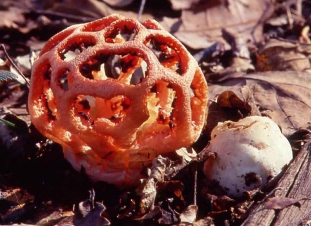 Όπως μπορείτε να δείτε στη φωτογραφία, το κόκκινο μανιτάρι δικτυωτού πλέγματος έχει ένα σφαιρικό ή ωοειδές σώμα με τη μορφή πλέγματος, για το οποίο έλαβε αυτό το όνομα. Αλλά αποκτά αυτόν τον τύπο καθώς ωριμάζει.