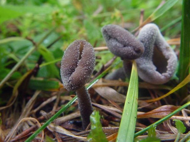 Μακρύς λοβός... Ένα βρώσιμο μανιτάρι με κύπελλο ή καπάκι σέλας ισοπεδωμένο στα πλάγια. Η εξωτερική επιφάνεια είναι ανώμαλη, γκρι ή με μοβ απόχρωση. Το εσωτερικό μέρος είναι ελαφρύτερο, λευκό και μπεζ. Το στέλεχος μπορεί να είναι λείο ή ανώμαλο, στενότερο στην κορυφή, το χρώμα της εσωτερικής επιφάνειας του καλύμματος. Ο πολτός είναι άοσμος και άγευστος, λεπτός, υδατώδης. Καρπός από τον Ιούνιο έως τις αρχές Οκτωβρίου. Προτιμά τα υγρά δάση, μπορούν να εγκατασταθούν σε βρύα και υπολείμματα σάπιου ξύλου, μεγαλώνουν σε ομάδες.