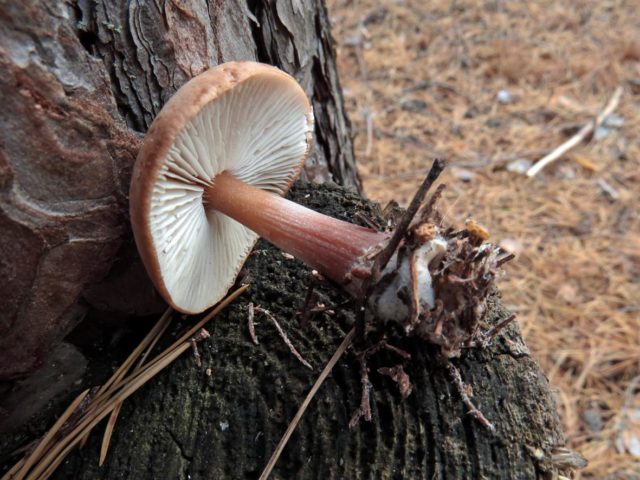 Η καστανιά Psaritella δεν μπορεί να συγχέεται με άλλα μέλη της οικογένειας. Το παχύ (ελαφρώς μικρότερο από 1,5 cm), καμπύλο ή στριμμένο βελούδινο πόδι έχει διαμήκεις ρίγες. Το μανιτάρι μπορεί να φτάσει σε μέγιστο ύψος 10 cm, αλλά συνήθως μεγαλώνει έως 6 - 7 εκ. Η σάρκα του είναι σκληρή. Το πόδι μπορεί να είναι κοίλο ή γεμάτο. Το χρώμα του είναι λευκό ή κρέμα.