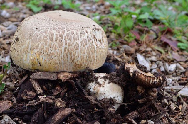 - Κίτρινο δέρμα (Agaricus xanthodermus). Η διαφορά από το μισό παπούτσι είναι ότι δεν υπάρχουν κλίμακες σε αυτό. Όταν πατηθεί, το καπάκι γίνεται κίτρινο σε αυτό το μέρος. Υπάρχει μια φαρδιά φούστα στο πόδι. Έχει επίσης μια δυσάρεστη μυρωδιά του καρποφόρου σώματος που χαρακτηρίζει δηλητηριώδη είδη.