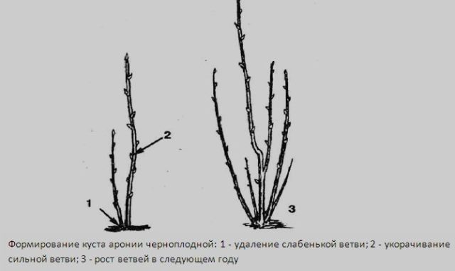 Η πρώτη διαμόρφωση απαιτείται για το chokeberry ακόμη και κατά την προσγείωση. Οι κλάδοι συντομεύονται για να μειώσουν το φορτίο στο ριζικό σύστημα και να δώσουν στους μαύρους θάμνους chokeberry το επιθυμητό σχήμα στο μέλλον. Η θέση του τελευταίου οφθαλμού στο στέλεχος καθορίζει την κατεύθυνση της ανάπτυξης μελλοντικών βλαστών.