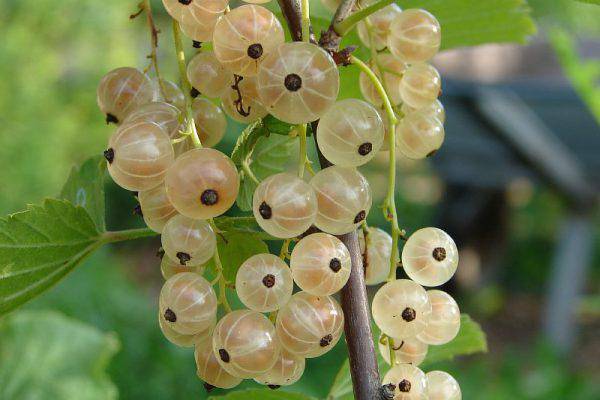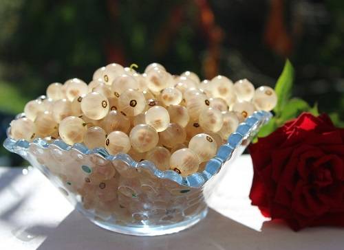 Τα φρούτα είναι μεγάλα έως 10 mm και ζυγίζουν έως 1,3 γραμμάρια. Αυτό φαίνεται καθαρά στη φωτογραφία. Με καλή γεωργική τεχνολογία, μπορείτε να συλλέξετε έως και 4 κιλά στρογγυλεμένα μούρα από έναν θάμνο. Φρούτα με πυκνό, διαφανές δέρμα ανοιχτού χρώματος κρέμας και γλυκόπικρο πολτό. Ωριμάζουν τα μούρα στη λευκή σταφίδα των Βερσαλλιών, σύμφωνα με την περιγραφή και τις κριτικές των κηπουρών, τηρούν σταθερά τα μίσχους και δεν θρυμματίζονται.