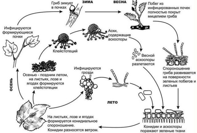Η εικόνα δείχνει ξεκάθαρα 2 στάδια ανάπτυξης του μύκητα: κωνιδιακή και μαρσιπολική. Το Conidial sporulation, ή το μυκήλιο, είναι η ίδια λευκή σκόνη άνθησης στους βλαστούς και τα φύλλα των φραγκοστάφυλων. Μετά τη μόλυνση των φύλλων και των νεαρών βλαστών, ο μύκητας εισέρχεται στη δεύτερη φάση - marsupial. Η καφέ άνθιση σε διάφορα μέρη του φυτού δεν είναι τίποτα περισσότερο από ένα μυκήλιο με τα καρποφόρα σώματα του μύκητα. Σε αυτήν τη μορφή, ο μύκητας αδρανοποιεί. Την άνοιξη, τα ασκοσπόρια ωριμάζουν, τα οποία ανοίγουν την άνοιξη μαζί με την άνθιση των φύλλων. Τα απορριφθέντα ασκοσπόρια μολύνουν μόνο νεαρά φύλλα και βλαστοί, ωοθήκες μούρων, σχηματίζοντας ξανά την ίδια λευκή άνθιση.