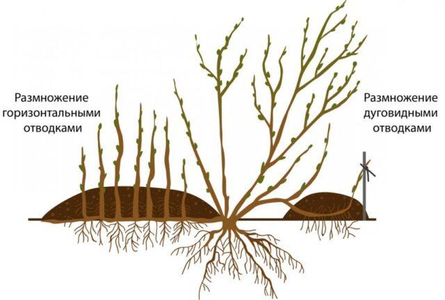 Τα στρώματα λαμβάνονται στο τέλος της άνοιξης - οι κάτω βλαστοί ενσταλάσσονται σε βάθος 10-15 cm, τρέφονται, ποτίζονται τακτικά, στρώνονται για το χειμώνα. Την άνοιξη, κόβονται όλα τα μοσχεύματα με ρίζες, μεταμοσχεύονται σε μόνιμο μέρος και γονιμοποιούνται με άζωτο.