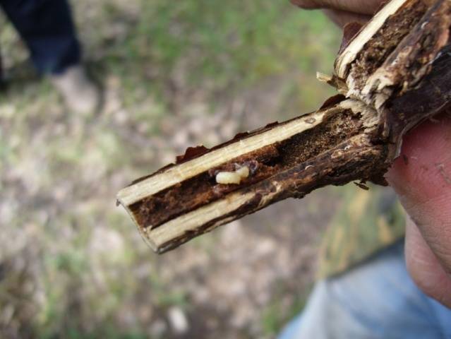 Εάν δείτε ότι ο πυρήνας είναι σκοτεινός, τότε αυτό είναι ένα σαφές σημάδι ζημιάς από το γυαλί σταφίδας - μια πεταλούδα παρασίτων. Την άνοιξη, μια πεταλούδα που μοιάζει με σφήκα βάζει τα αυγά της στις ρωγμές στο φλοιό ενός θάμνου σταφίδας. Μετά από 2 εβδομάδες από τα αυγά τους, οι κάμπιες εκκολάπτονται, οι οποίες διεισδύουν στο στέλεχος. Ζουν και τρώνε εκεί. Το μαύρο μέσον του στελέχους είναι ο καρπός της δραστηριότητας των κάμπιων πεταλούδας σκαθάρι.