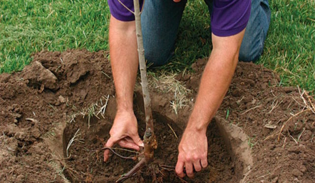 Για να φυτέψετε κεράσια, η τρύπα φύτευσης γεμίζει στα μισά του δρόμου με έτοιμο χώμα. Μετά από αυτό, το δενδρύλλιο εκτίθεται ακριβώς με τέτοιο τρόπο ώστε το κολάρο της ρίζας να προεξέχει 3-5 cm πάνω από το επίπεδο του εδάφους. Μετά από αυτό, κάθε δέντρο ποτίζεται με 10-15 λίτρα ζεστού νερού.