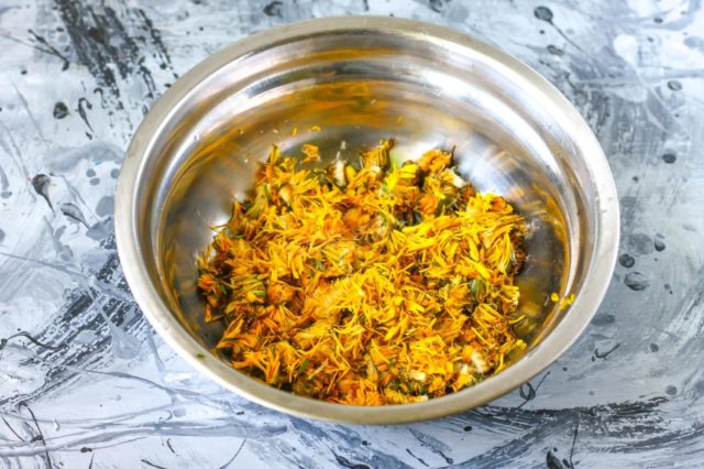 - Τα λουλούδια πλένονται σχολαστικά και περνούν μέσω μύλου κρέατος ή τεμαχίζονται με μπλέντερ.
