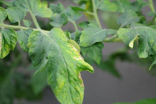 - Έλλειψη σιδήρου οδηγεί σε χλώρωση, η οποία εκδηλώνεται με την εμφάνιση θολών, γκρίζων κηλίδων στο φαινομενικά υγιές πράσινο φύλλο ντομάτας. Σε αυτήν την περίπτωση, οι φλέβες στο φύλλο αποκτούν έντονο πράσινο χρώμα.