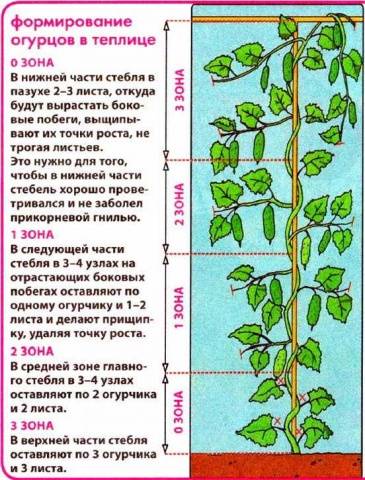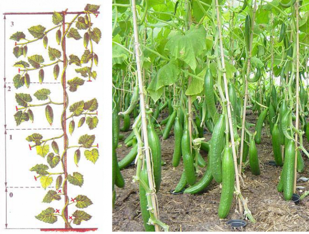 Για να χρησιμοποιήσετε αποτελεσματικά την περιοχή που διατίθεται για φύτευση αγγουριών, είναι συνηθισμένο να τα δέσετε σε πέργκολα και να τσιμπήσετε τους πλευρικούς βλαστούς σύμφωνα με το σχήμα.