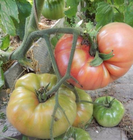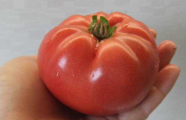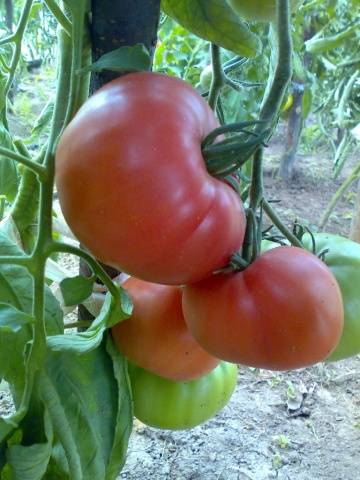 - οι ντομάτες είναι μεγάλες, στρογγυλές, ελαφρώς πεπλατυσμένες, ροζ χρώμα.
