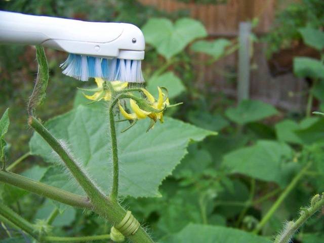 - Η ντομάτα συνιστάται στο θερμοκήπιο επικονιάστε τον εαυτό σας... Το γεγονός είναι ότι η θερμότητα και η υψηλή υγρασία οδηγούν σε συσσώρευση γύρης - δεν μετακινείται από λουλούδι σε λουλούδι.Εάν οι ντομάτες δεν βοηθηθούν, ο αριθμός των ωοθηκών θα είναι εξαιρετικά χαμηλός.