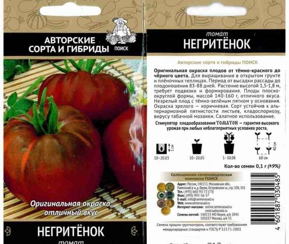 Οι ντομάτες της ποικιλίας Negritenok αποκτήθηκαν από τους κτηνοτρόφους της αγροτικής εταιρείας Poisk περίπου πριν από 10 χρόνια και το 2010 καταχωρίστηκαν στο Κρατικό Μητρώο Επιτευγμάτων αναπαραγωγής της Ρωσίας. Το Tomato Negritenok ανήκει σε μια σειρά ποικιλιών του συγγραφέα, αν και το συγκεκριμένο όνομα του συγγραφέα παραμένει άγνωστο. Συνιστάται για καλλιέργεια σε όλη τη Ρωσία σε ανοιχτό έδαφος ή σε συνθήκες θερμοκηπίου.