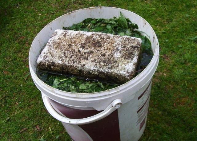 - Πράσινα λιπάσματα... Τέτοιες συνθέσεις παρασκευάζονται με βάση την έγχυση ζιζανίων, μπορείτε να χρησιμοποιήσετε συνηθισμένο γρασίδι που απομένει μετά το βοτάνισμα των κρεβατιών ή να μαζέψετε τσουκνίδες, αψιθιά. Τα χόρτα χύνονται με νερό και αφήνονται στον ήλιο υπό έντονη πίεση - σε μερικές μέρες η έγχυση είναι έτοιμη, μπορεί να αραιωθεί με νερό και νερό τα αγγούρια. Τέτοια σίτιση θα βοηθήσει επιπλέον στην πρόληψη επιθέσεων παρασίτων εντόμων και στην προστασία των αγγουριών από ασθένειες.