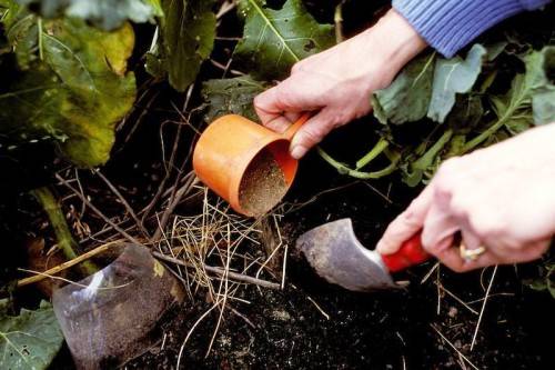 - Ανακατέψτε την ξηρή τέφρα ξύλου με υπερφωσφορικό και πασπαλίστε το χώμα ανάμεσα στους θάμνους αγγουριού με αυτό το μείγμα, ενσωματώστε ελαφρά το λίπασμα στο έδαφος.