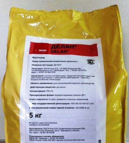 Για να μην χάσετε τη συγκομιδή και τους θάμνους μούρων, το αμπέλι πρέπει να υποβληθεί σε επεξεργασία με μυκητοκτόνο Delan. Το φυτό ψεκάζεται 6 φορές καθ 'όλη τη διάρκεια της σεζόν, με κάθε επόμενη διαδικασία να πραγματοποιείται μετά από 8-11 ημέρες. Σύμφωνα με τις συνημμένες οδηγίες για 1 m2 Η περιοχή καταναλώνει 0,05-0,07 γραμμάρια μυκητοκτόνου ή 90-100 ml υγρού εργασίας. Το προστατευτικό αποτέλεσμα διαρκεί έως και 28 ημέρες.