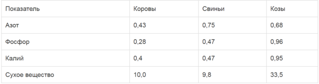 Προφανώς, λόγω του ενδιαφέροντος των μεγάλων εκμεταλλεύσεων στην εκτροφή αιγών, δεν έχουν πραγματοποιηθεί σοβαρές μελέτες σχετικά με τη σύνθεση της κοπριάς αιγών. Και οι ιδιοκτήτες αυτών των ζώων δεν χρειάζεται να δώσουν δείγματα για ανάλυση. Σε κάθε περίπτωση, θα έχουν όλη την κοπριά "πάει" στα κρεβάτια. Μόνο αυτό μπορεί να εξηγήσει τις έντονες αποκλίσεις στα δεδομένα σχετικά με τη χημική σύνθεση της κοπριάς. Αλλά με πολλούς τρόπους, η περιεκτικότητα σε θρεπτικά συστατικά εξαρτάται από το είδος του είδους που αναλύθηκε.