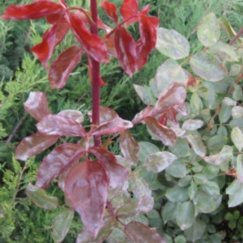 Στη συνέχεια, η λευκή επίστρωση γίνεται βρώμικη γκρι και στη συνέχεια καφέ. Και στις πληγείσες περιοχές των φύλλων και των βλαστών του τριαντάφυλλου, εμφανίζονται μικρές σπόρες σκούρου καφέ χρώματος.