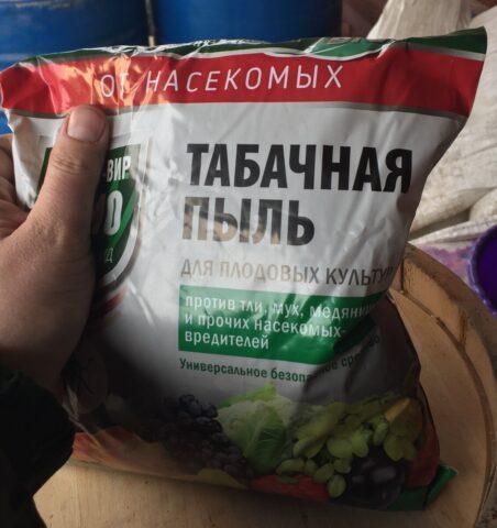 Το φυτό καπνού φυτεύεται συχνά δίπλα σε φράουλες και άλλες καλλιέργειες. Χρησιμοποιείται επίσης με τη μορφή σκόνης, η οποία λαμβάνεται σε ποσότητα 2 ποτηριών (συνολικά 400 ml) και διαλύεται σε ένα κουβά με ζεστό, αλλά όχι βραστό νερό για 3 ημέρες. Ανακατέψτε, φιλτράρετε και αρχίστε να εργάζεστε.