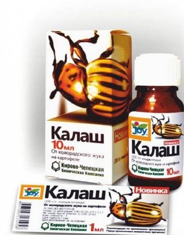 Το "Kalash" είναι ένας παράγοντας νέας γενιάς που έχει σχεδιαστεί για την καταπολέμηση ενηλίκων και προνυμφών του σκαθάρι της πατάτας του Κολοράντο. Το δραστικό συστατικό του φαρμάκου είναι η ιμιδακλοπρίδη (συγκέντρωση 200 g / l). Αναφέρεται σε χαμηλά τοξικά εντομοκτόνα επαφής με παρατεταμένη περίοδο προστασίας. Το "Kalash" επηρεάζει το σκαθάρι της πατάτας του Κολοράντο, μπαίνοντας στο έντερο με φαγητό ή μέσω άμεσης επαφής. Έχει πολλά πλεονεκτήματα έναντι των φαρμάκων παρόμοιου σκοπού: