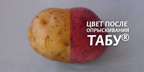 Η χρωστική χρωστική ουσία, η οποία αποτελεί μέρος του προϊόντος, σας επιτρέπει να εφαρμόσετε ομοιόμορφα το φάρμακο σε όλους τους κόνδυλους. Χάρη σε αυτό, κάθε πατάτα καλύπτεται πλήρως με ένα στρώμα ουσίας που δεν θρυμματίζεται ή τρίβεται από την επιφάνειά του.