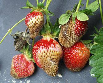 Αρχικά, οι φράουλες γίνονται υδατώδεις, χάνουν το φυσικό τους χρώμα και αποκτούν καφέ απόχρωση. Τα μούρα δεν έχουν το χαρακτηριστικό άρωμα και γεύση φράουλας. Στη συνέχεια, ο καρπός καλύπτεται με μια άχρωμη άνθιση, η οποία μετά από λίγο γίνεται μαύρο.