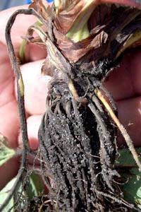 Μια άλλη ασθένεια των θάμνων φράουλας είναι η σήψη των ριζών. Εμφανίζεται για πρώτη φορά σε νέες ρίζες, μοιάζει με μαύρες κηλίδες που σταδιακά μεγαλώνουν και συγχωνεύονται.