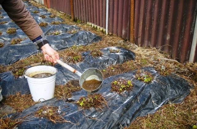 - Μια μικτή σύνθεση 2 κουταλιών της σούπας νιτροφόσκα, 20 γραμμάρια αλατιού καλίου και ένας κουβάς νερού χρησιμοποιείται για το νερό που έχει ήδη κόψει τους θάμνους. Ένα λίτρο αυτού του λιπάσματος χύνεται κάτω από κάθε θάμνο. Μετά από μερικές μέρες, το έδαφος κάτω από τις φράουλες πρέπει να σκουπίζεται με πριονίδι, τύρφη, βελόνες πεύκου ή χούμο.