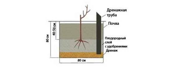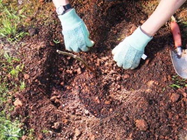 - Στη μέση του λάκκου χύνεται γόνιμο έδαφος με ανάχωμα. Θα πρέπει να είναι 10 εκατοστά κάτω από τις πλευρές του λάκκου. Σε αυτό φυτεύεται ένα δενδρύλλιο. Οι ρίζες του βυθίζονται σε πηλό.