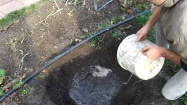 - Και πάλι γεμίζουν την τρύπα με νερό. Όταν απορροφάται, το λάκκο γεμίζει με γη και πασπαλίζεται το κάλυμμα στην κορυφή.