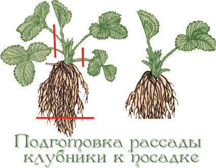 Κατά την επιλογή των δενδρυλλίων, πρέπει να προσέξετε το πλάτος του κολάρου ρίζας. Σε υγιείς φράουλες, είναι τουλάχιστον 1 εκ. Πρέπει να αποκόπτονται πολύ μεγάλες ρίζες, αφήνοντας περίπου 5-8 εκ. Όλα τα αποξηραμένα και κατεστραμμένα φύλλα πρέπει να αποκοπούν. Στη συνέχεια, το δενδρύλλιο κατεβαίνει στην προετοιμασμένη τρύπα, απλώνοντας τις ρίζες. Στη συνέχεια, η τρύπα καλύπτεται με χώμα στην αρχή του άνω μέρους του θάμνου.